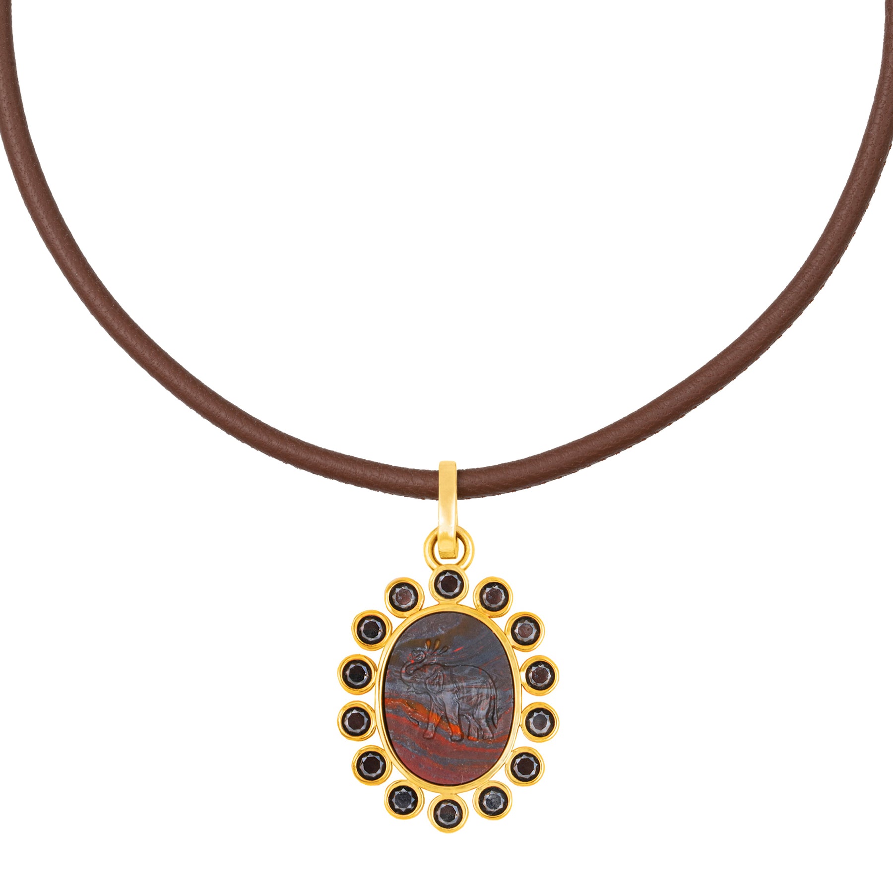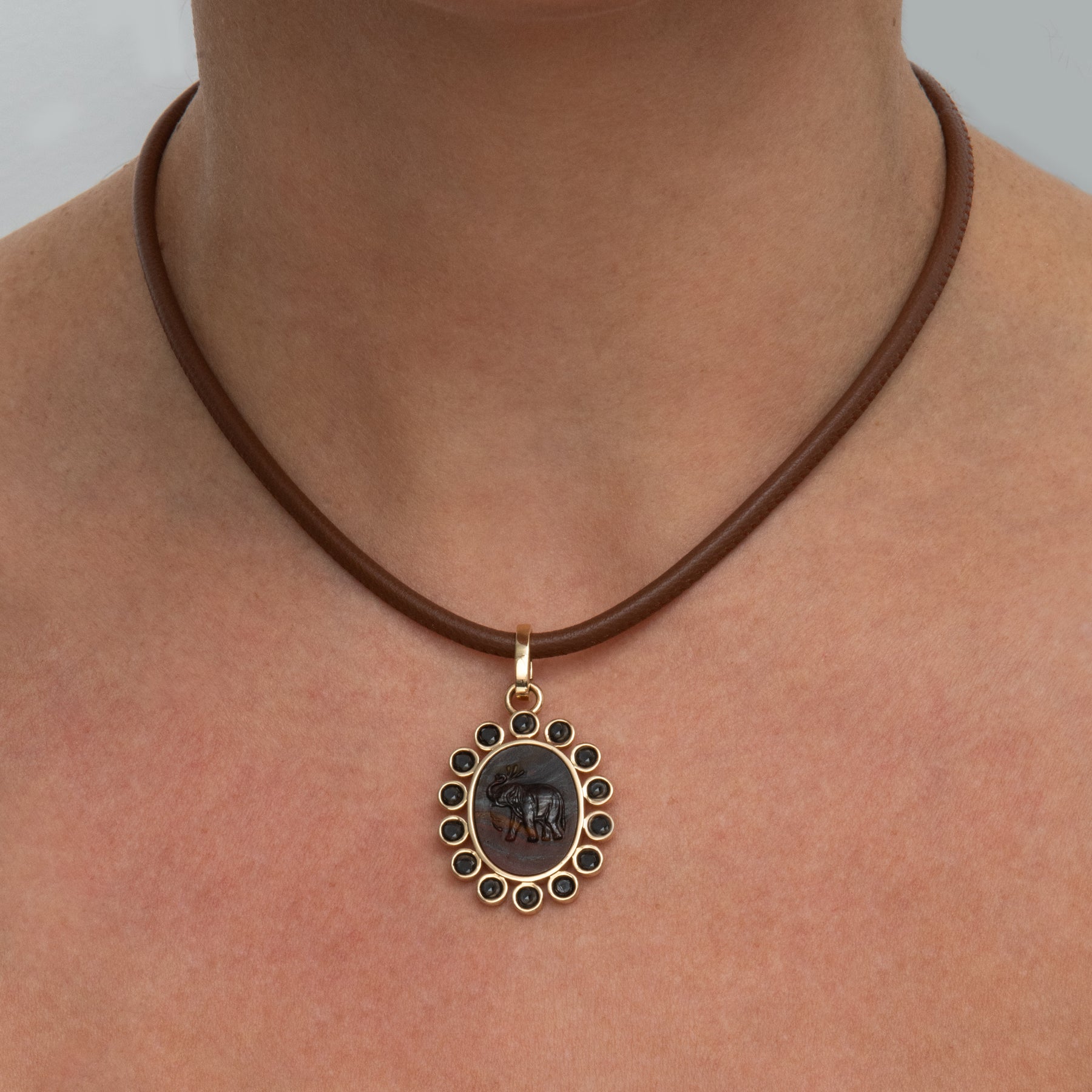 Intaglio tiger’s eye elephant pendant featuring a 6.8ct carved tiger’s eye surrounded by 3.0ct of black diamonds. Set in 14K yellow gold, this handcrafted gemstone pendant pairs detailed carving with high-contrast diamond accents for everyday or layered styling.
