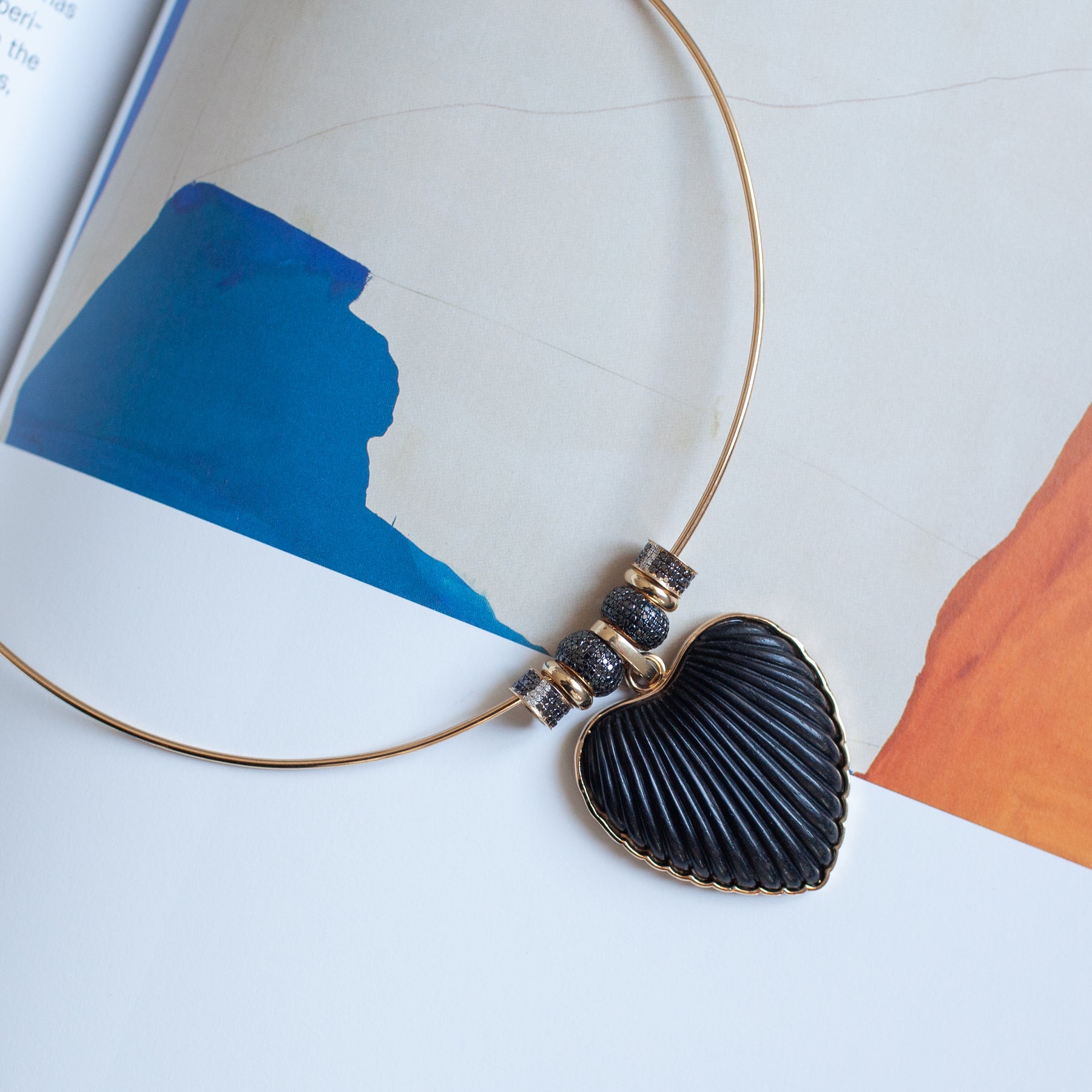 Oversized ebony heart pendant with fluted detailing, set in 14K yellow gold and accented with 1.45ct of black and white diamonds on yellow gold beads. Artisan-crafted statement necklace designed with natural ebony and fine goldwork for a bold, sculptural profile.
