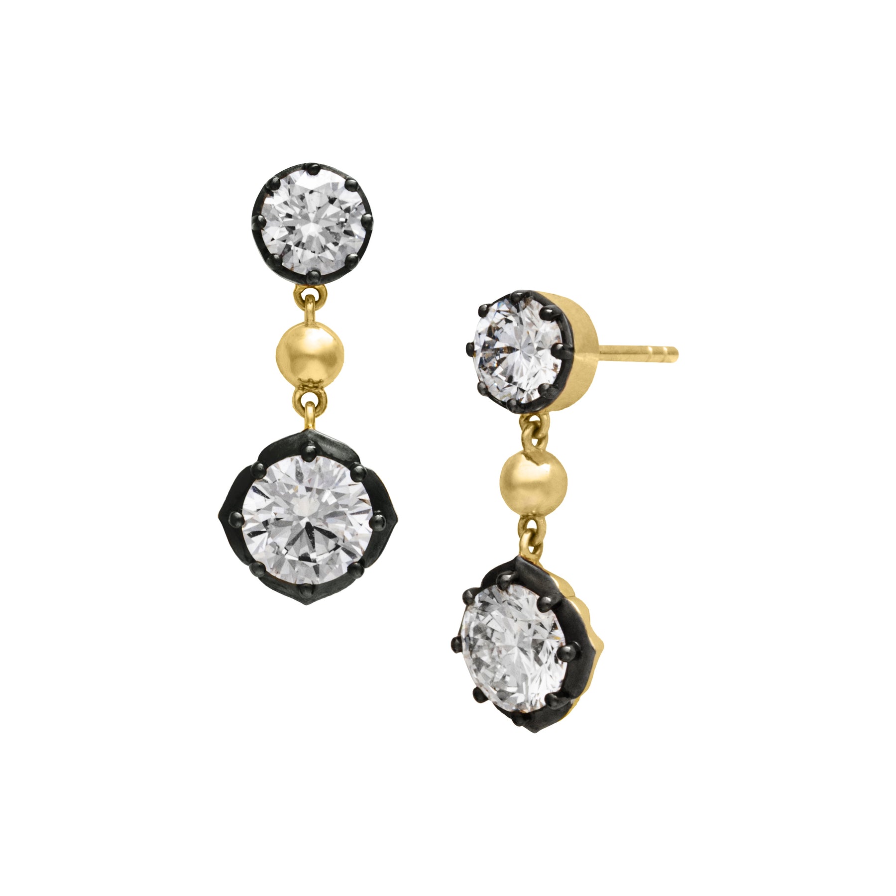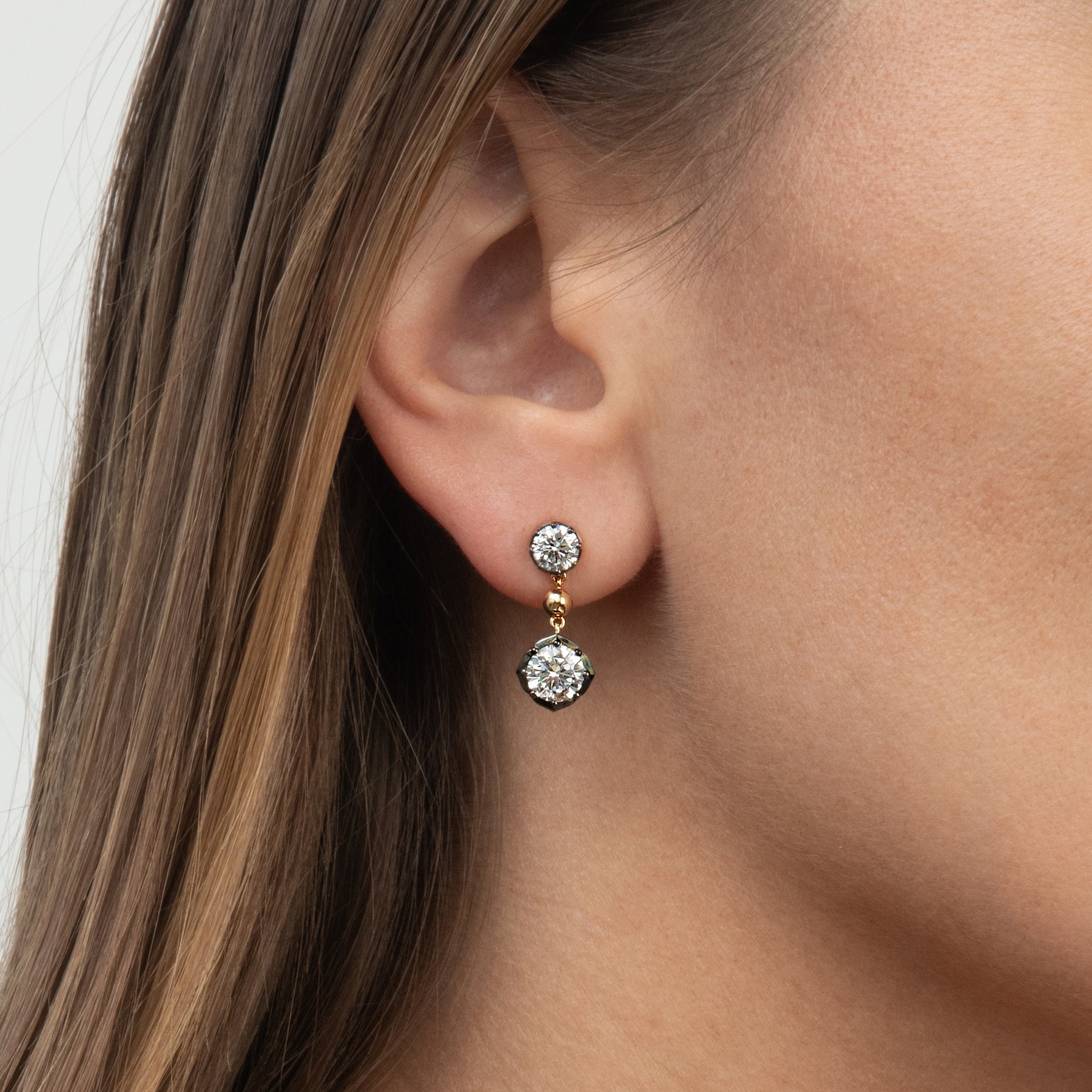 Lab-created diamond earrings totaling 3.0ct, set in 14K yellow gold with black rhodium accents. Handcrafted double-stone dangle earrings designed to highlight exceptional diamond brilliance and refined craftsmanship.