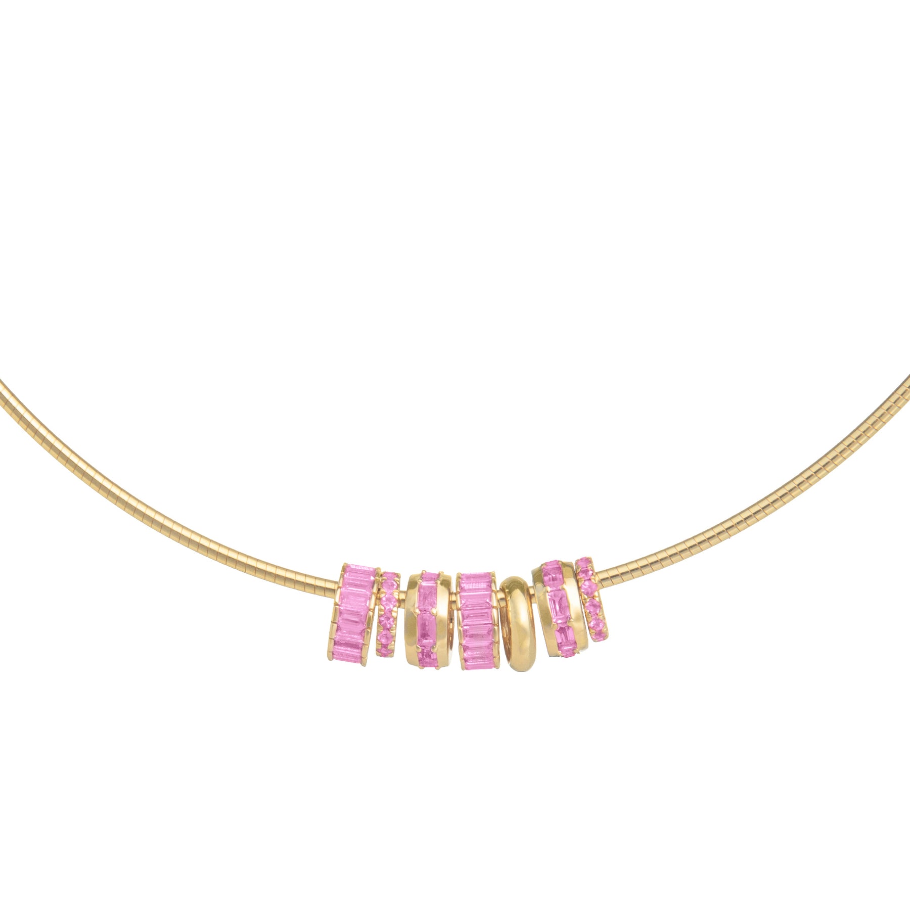 The Grace Beaded Choker Necklace features a 2.65ct sequence of pink sapphire beads set in 14K yellow gold. The soft color and polished gold elements create a subtle interplay of texture along the 14–16" adjustable choker. Designed to sit at the collarbone, it layers easily with pendants or brings a hint of color when worn on its own.