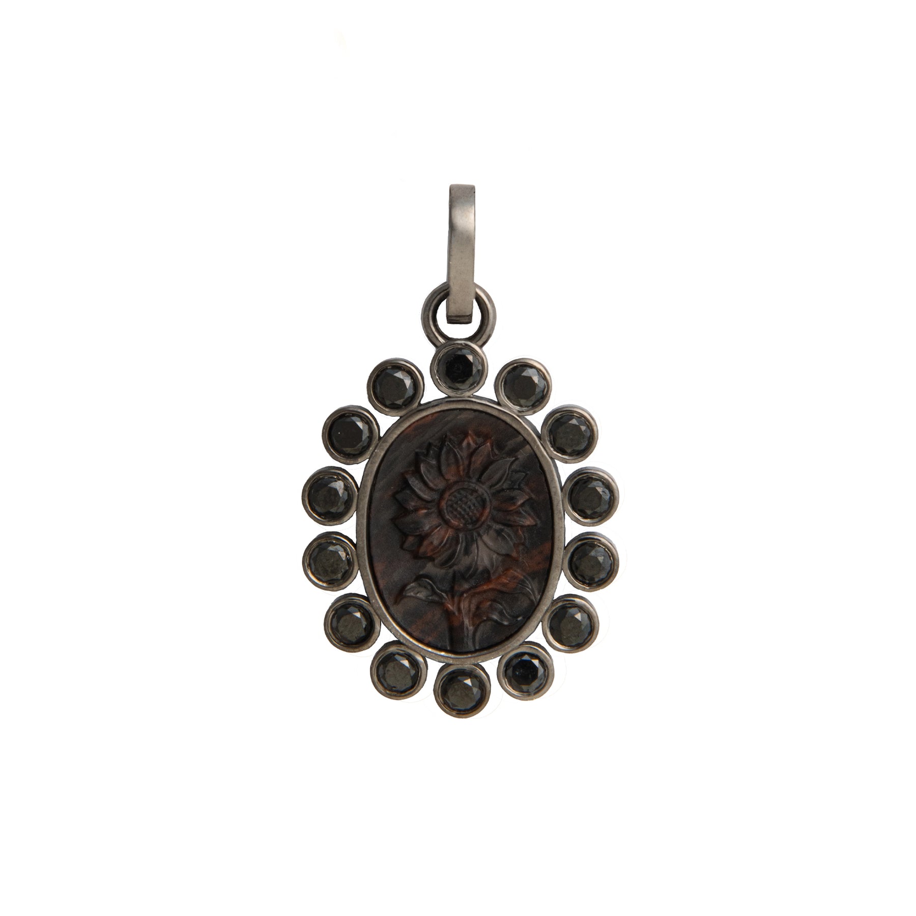 The Sienna Small Intaglio Sunflower Pendant Necklace features a hand-carved Tiger’s Eye sunflower surrounded by black diamonds totaling 3.09ct. Set in 14K white gold with black rhodium, the pendant is suspended from a matching white gold chain, creating a cohesive, luminous silhouette.