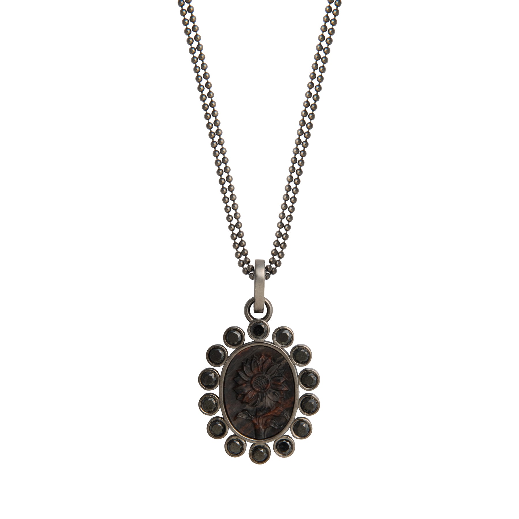 The Sienna Small Intaglio Sunflower Pendant Necklace features a hand-carved Tiger’s Eye sunflower surrounded by black diamonds totaling 3.09ct. Set in 14K white gold with black rhodium, the pendant is suspended from a matching white gold chain, creating a cohesive, luminous silhouette.