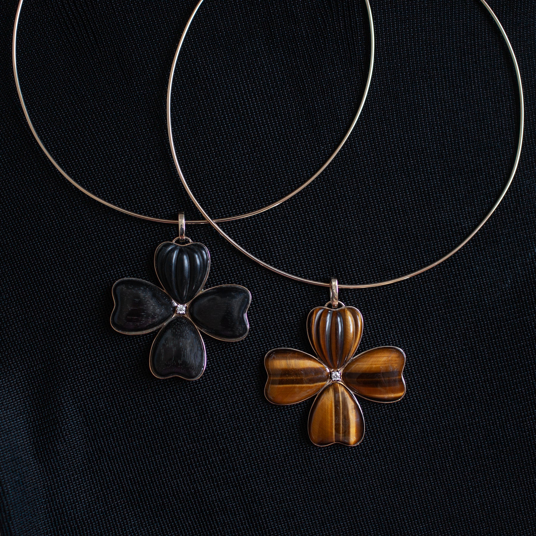 Crafted from solid 14k yellow gold, this choker features an ebony clover pendant centered with a single diamond accent. Ebony offers a rich, smooth contrast to the gold, while the diamond provides a touch of light, creating a design that balances organic texture with refined craftsmanship.