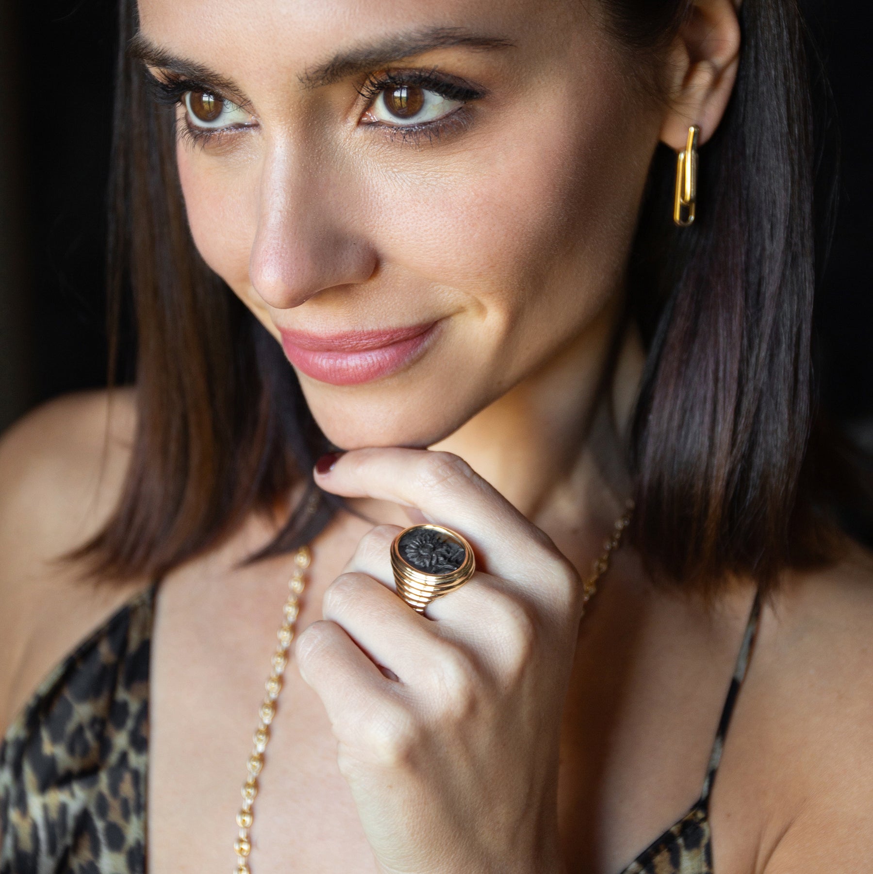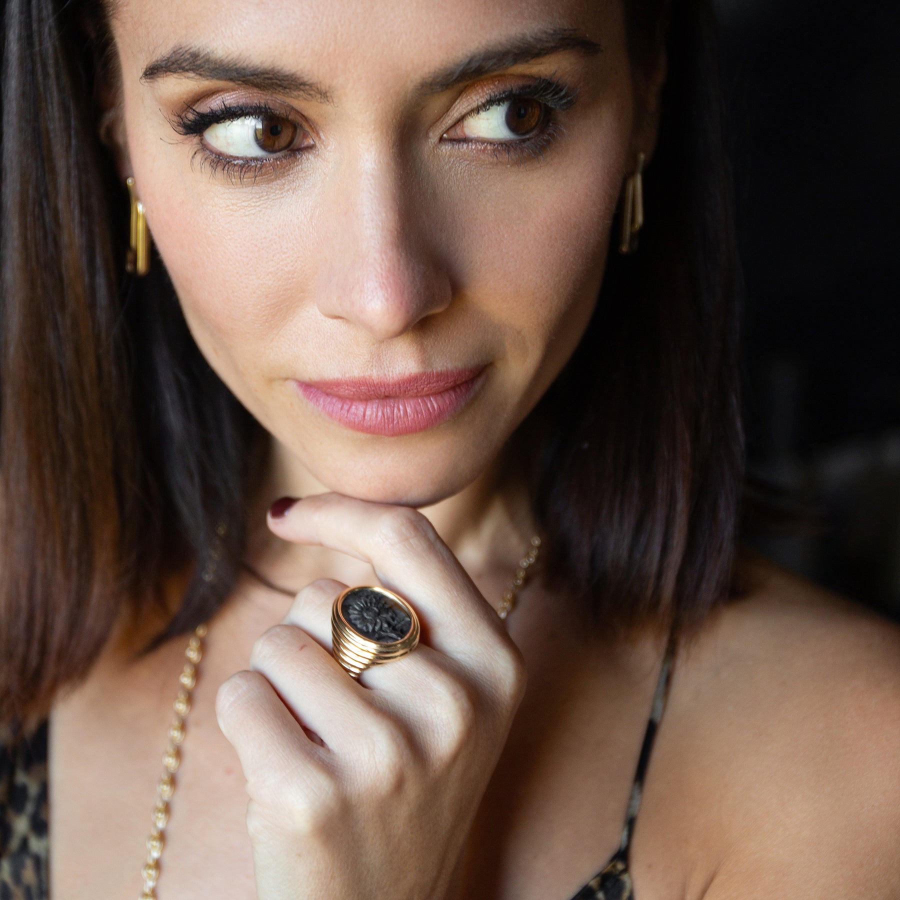 The Sienna Intaglio Waved Signet Ring showcases a hand-carved black jasper sunflower, framed in 14K yellow gold with a softly waved bezel. Its oversized oval profile highlights the depth of the carving while giving the ring a strong, expressive presence. Designed to stand alone or paired with other gold bands, it’s a piece that combines artistry with everyday wearability.