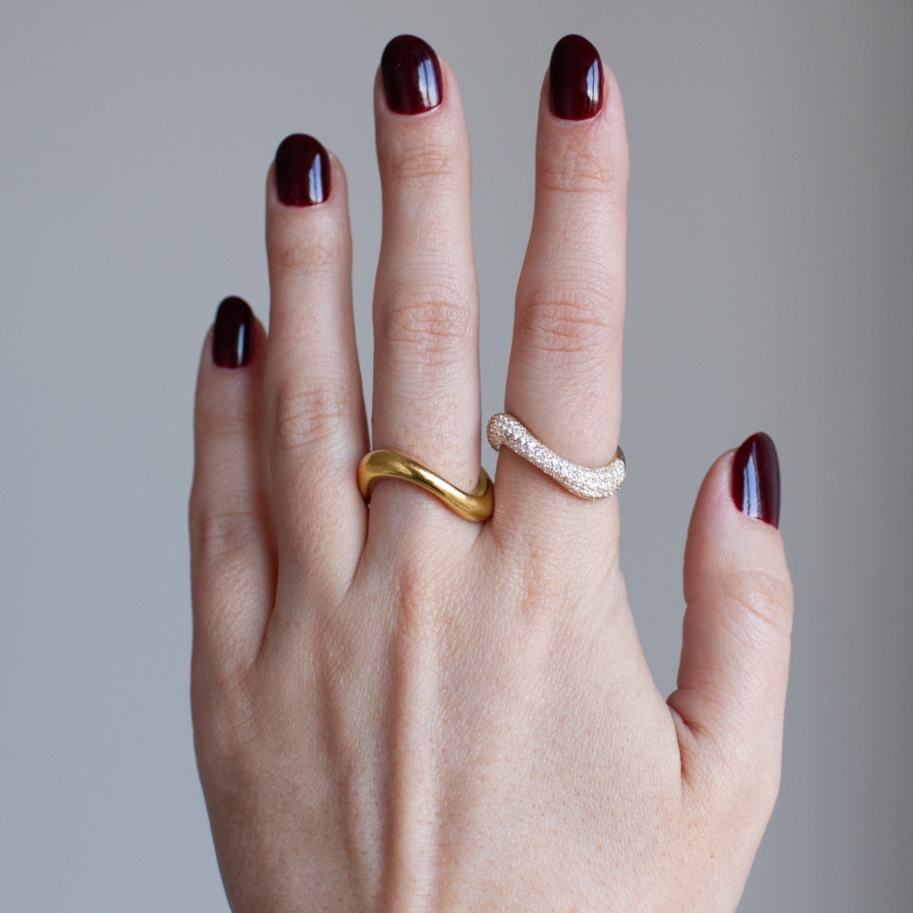 14K yellow gold curved band with an organic, sculptural silhouette. Handcrafted gold ring designed for everyday wear, offering a fluid shape that pairs easily with pavé rings, statement bands, or minimalist stacks.