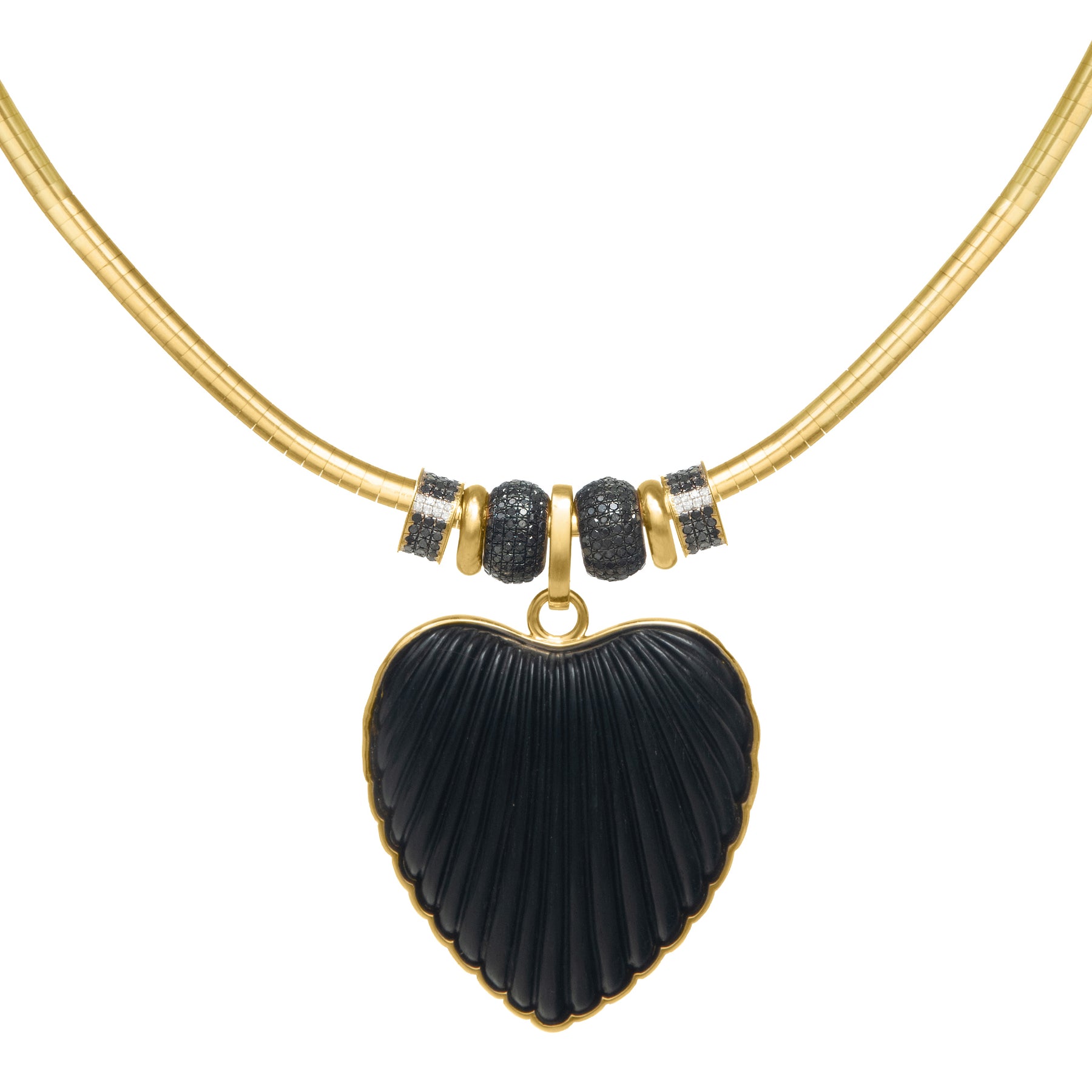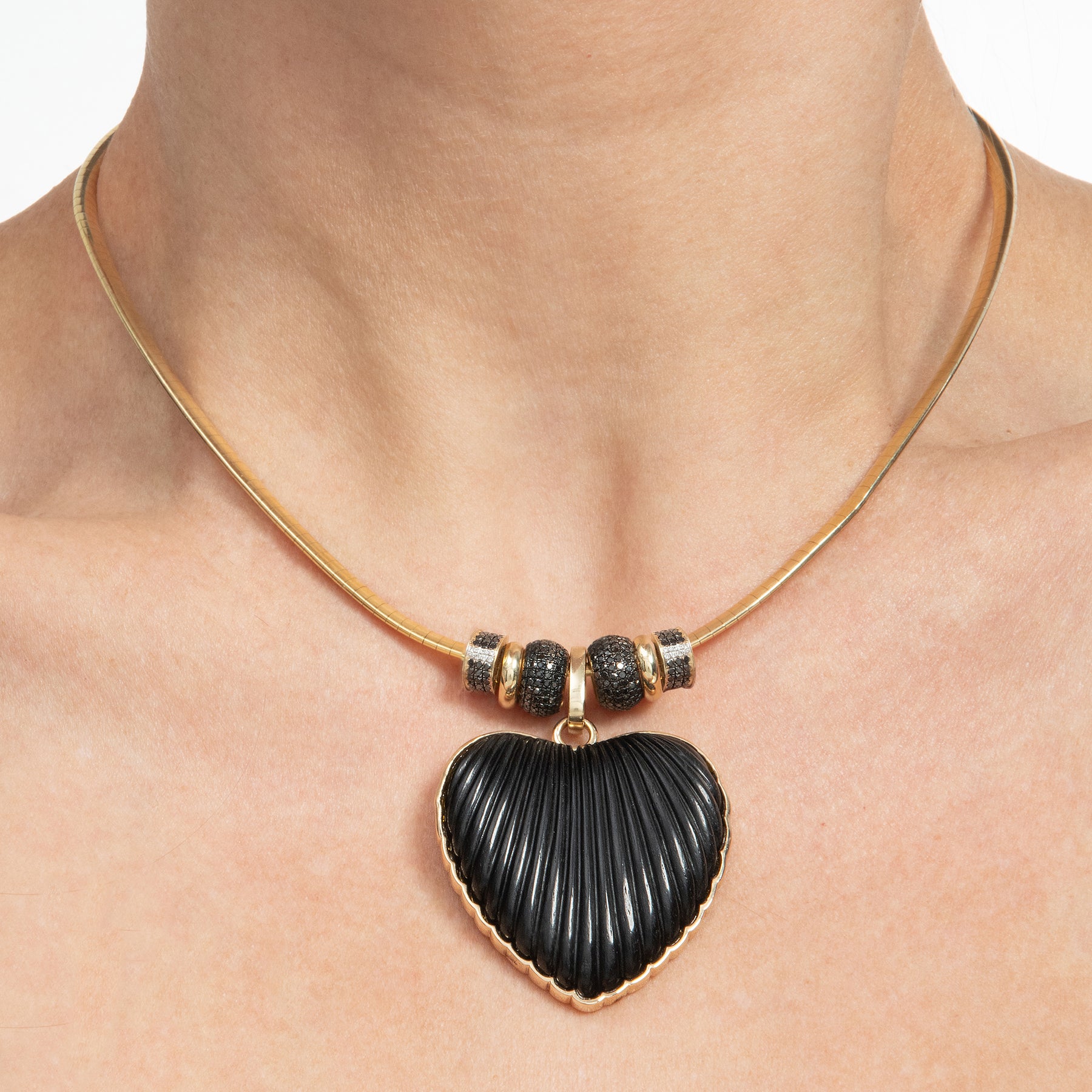 Oversized ebony heart pendant with fluted detailing, set in 14K yellow gold and accented with 1.45ct of black and white diamonds on yellow gold beads. Artisan-crafted statement necklace designed with natural ebony and fine goldwork for a bold, sculptural profile.