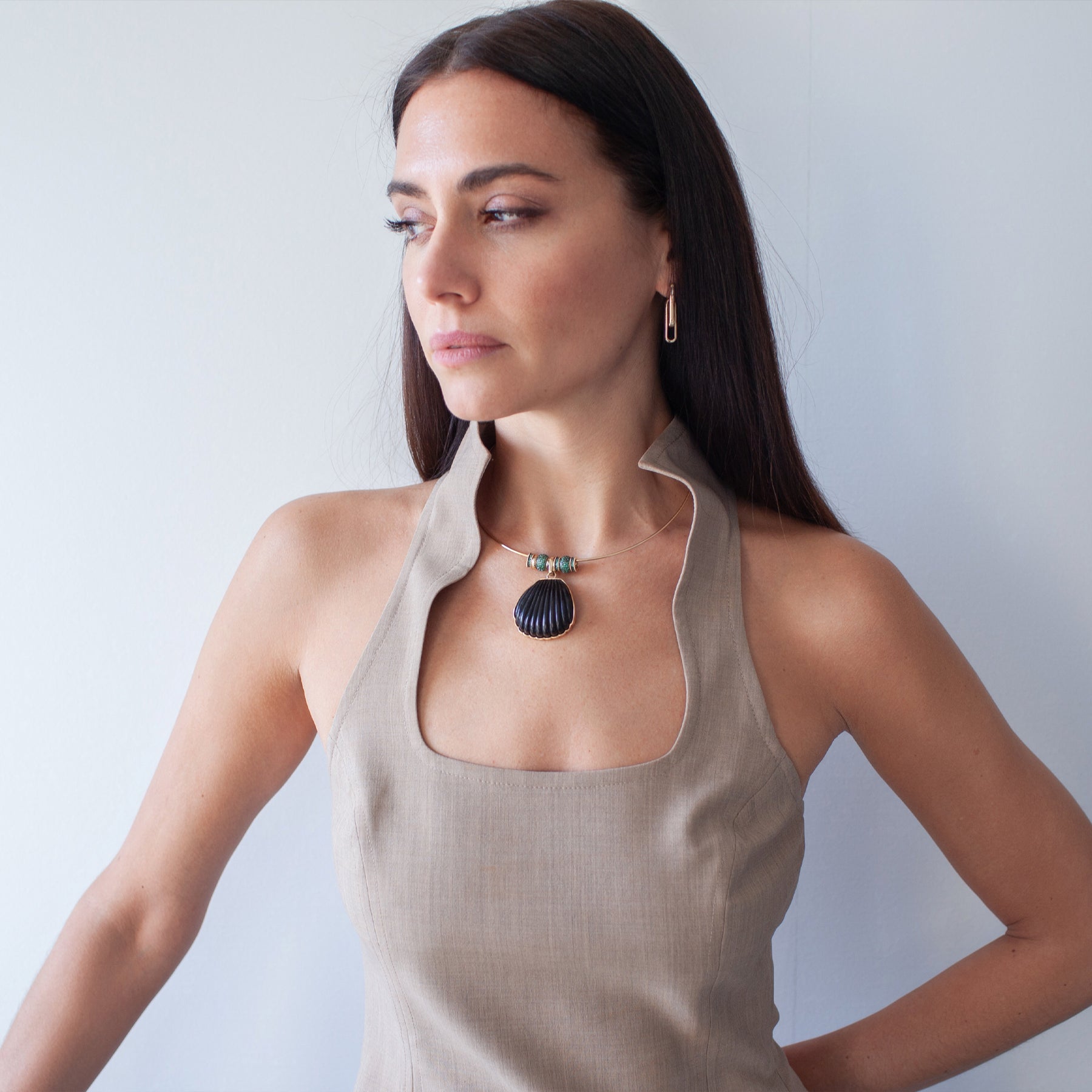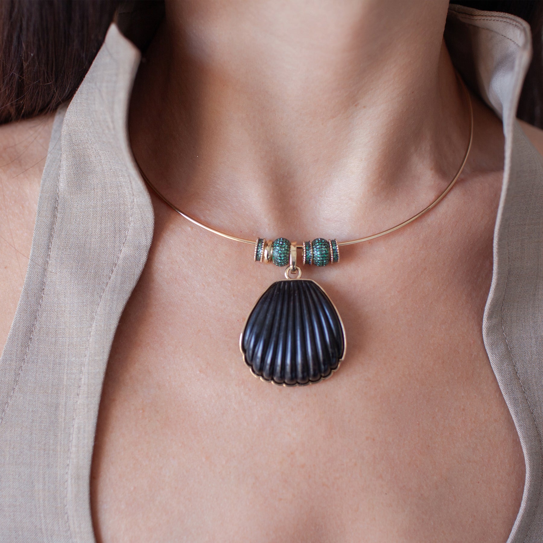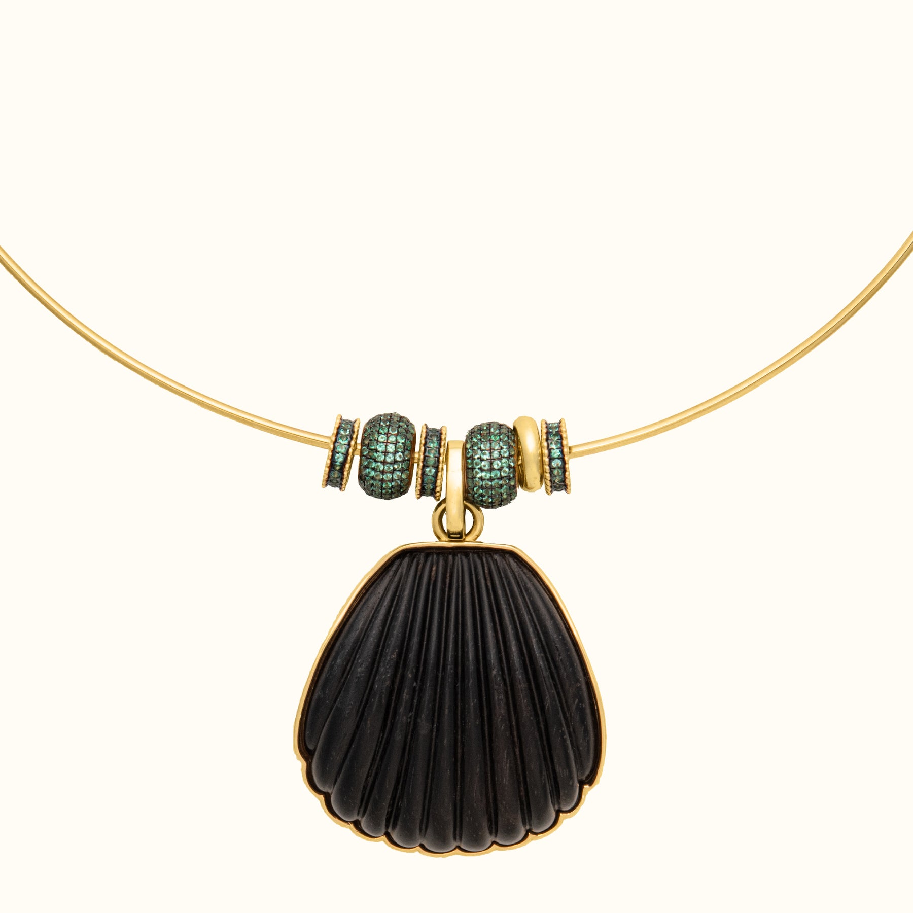 The Antonia Large Seashell Pendant on Choker features carved ebony alongside gold and emerald deads. Designed with generous scale, it layers easily on a choker or chain and adds depth through contrast and texture.