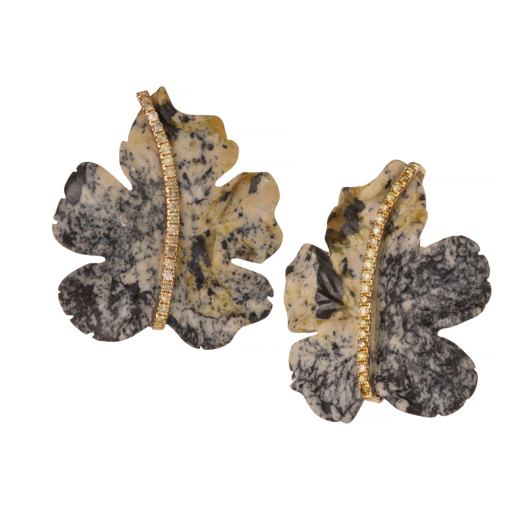 The Antonia Leaf Earrings feature carved multi-color jasper in a leaf-inspired shape, highlighting the natural variation within the stone. A row of diamonds totaling 0.65ct is set in 18K yellow gold, adding subtle brightness and structure to the design. Measuring 1.5" long, these earrings offer a balanced statement with organic texture.