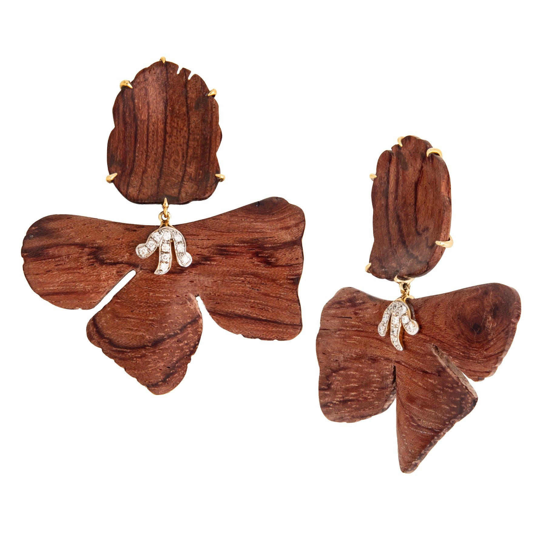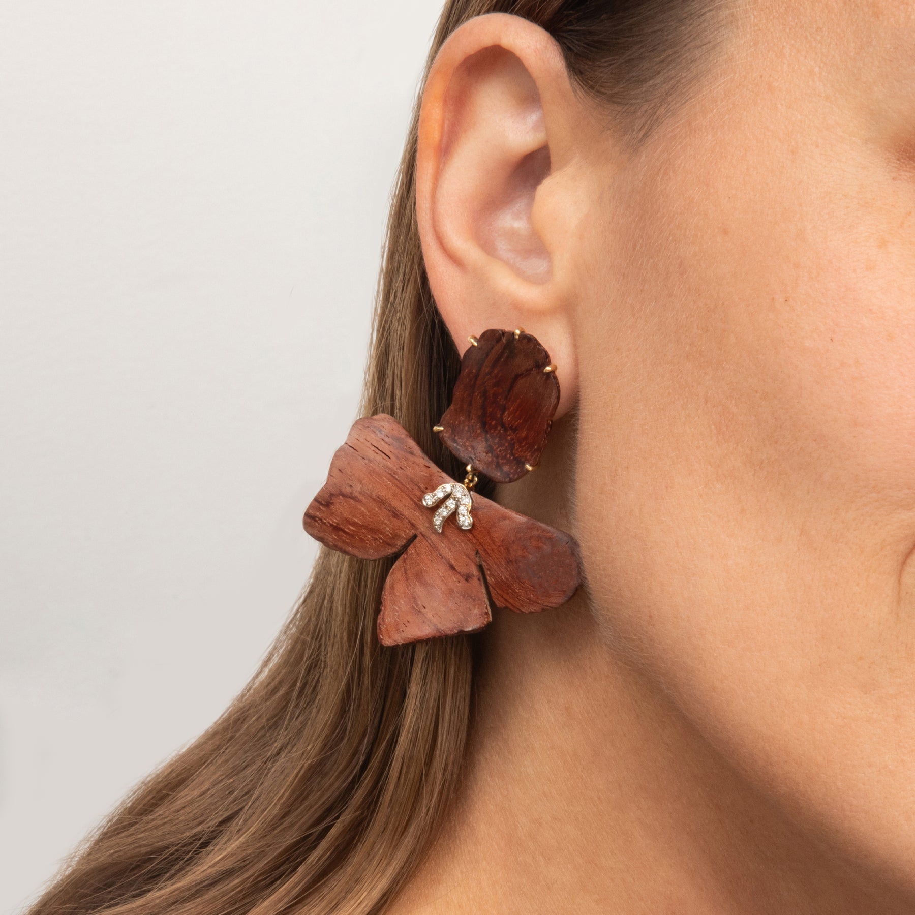 Handcrafted from 18K yellow gold, these earrings feature petals carved from rosewood, accented by a central diamond. The natural variation in rosewood creates warmth and depth, while the diamond adds brilliance. Flexible construction ensures comfortable wear and subtle movement.