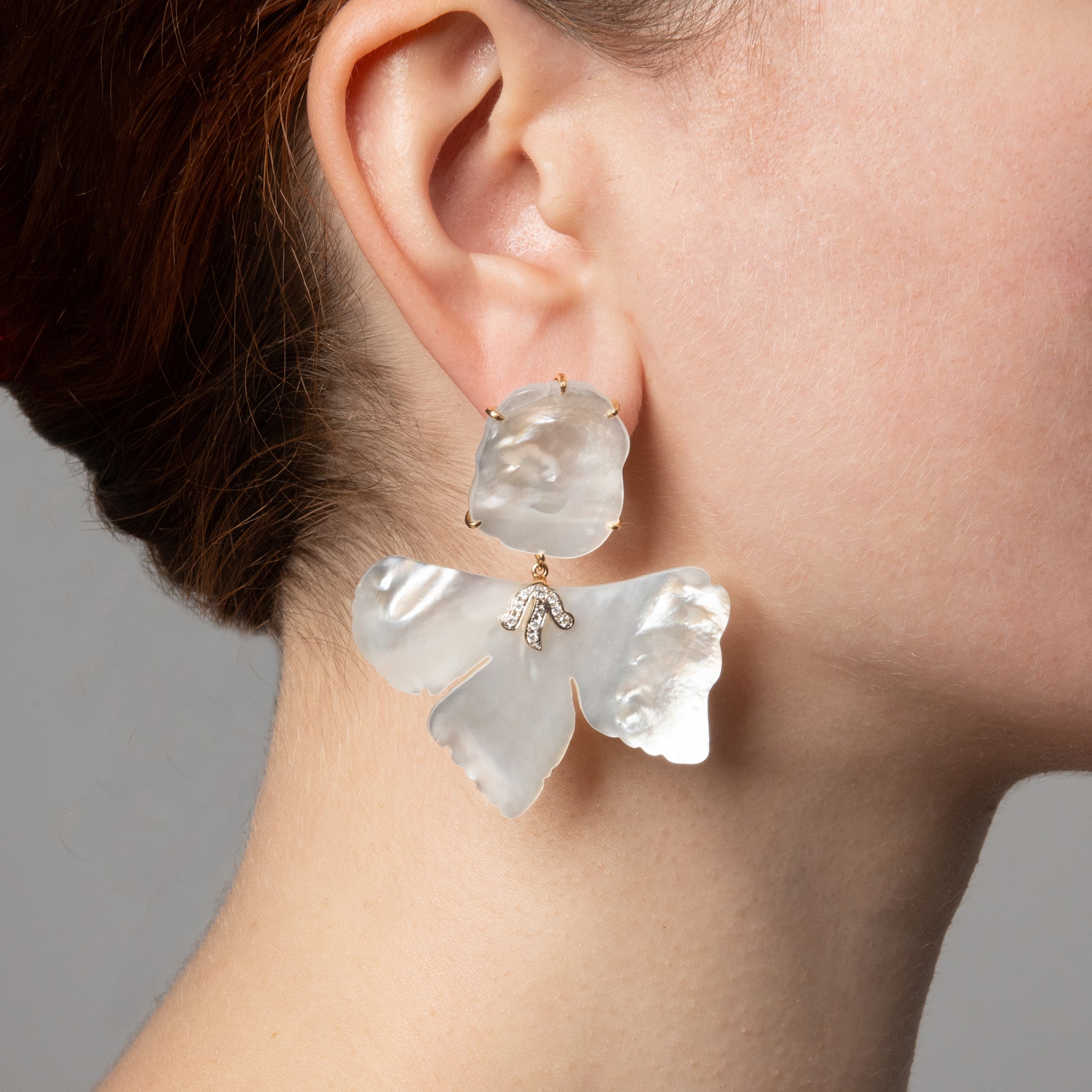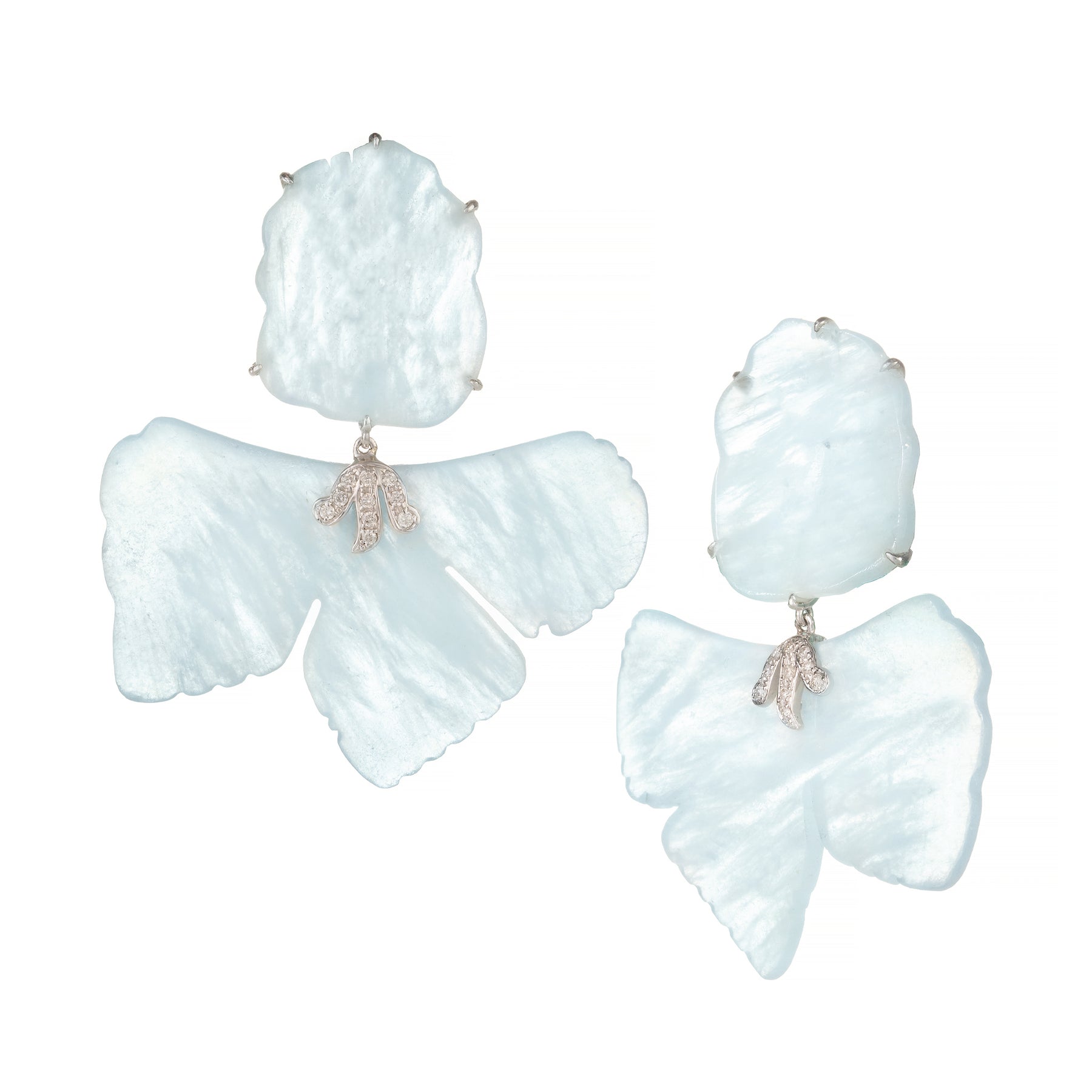The Antonia Oversize Flexible Iris Earrings feature sculptural Aquamarine petals accented with pavé diamonds totaling 0.22ct, set in 18K white gold. Each earring is designed with a flexible connection that moves naturally, showcasing the luminous depth and organic shape of the Mother of Pearl.