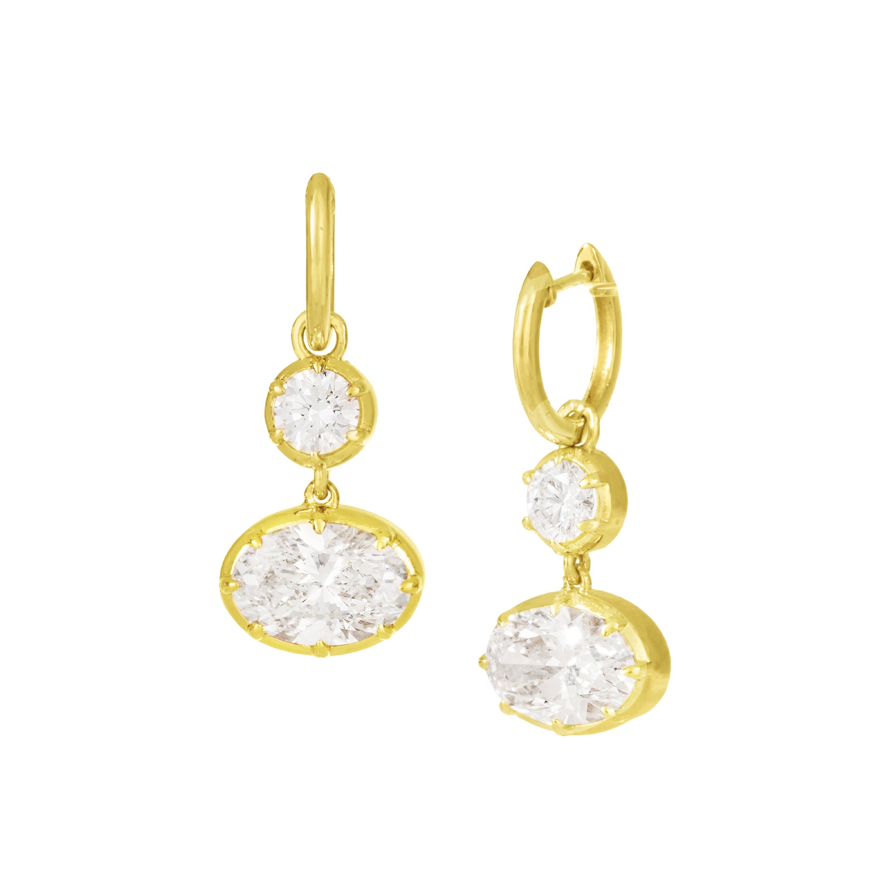The Gabriella Double Round & Oval Earring features a two-stone drop design with lab-created diamonds totaling 5.5ct set in 14K yellow gold. A round diamond sits above an oval-cut diamond, creating a clean, balanced silhouette with soft movement. Designed for everyday wear or occasion styling, it offers a polished take on classic diamond drops.