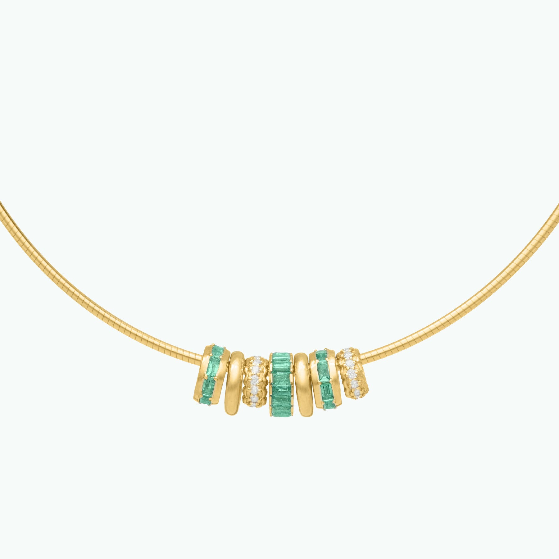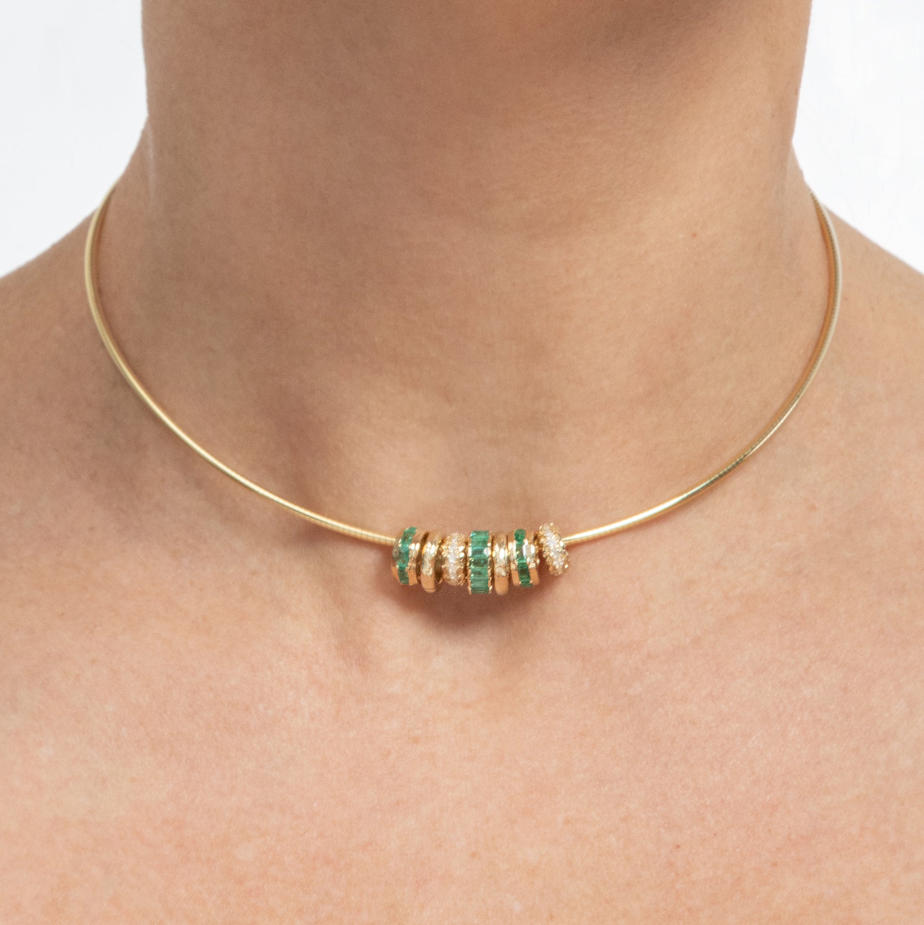 The Grace Beaded Choker Necklace features a mix of emerald and diamond beads set in 14K yellow gold. Alternating textures and tones create an easy balance of color and shine along the 14–16" adjustable choker. Designed to sit comfortably at the collarbone, this piece layers well with pendants or adds interest on its own.