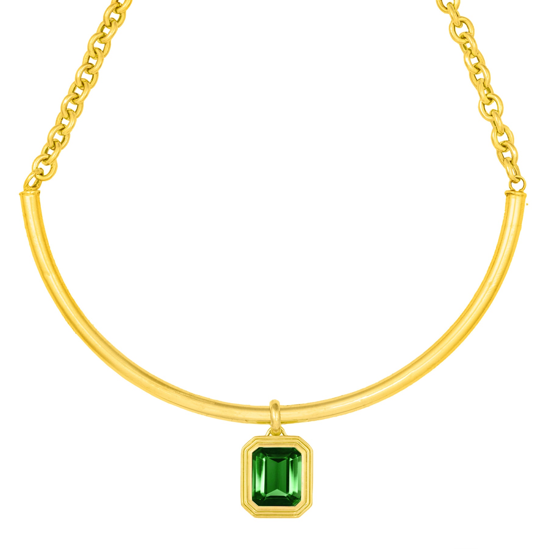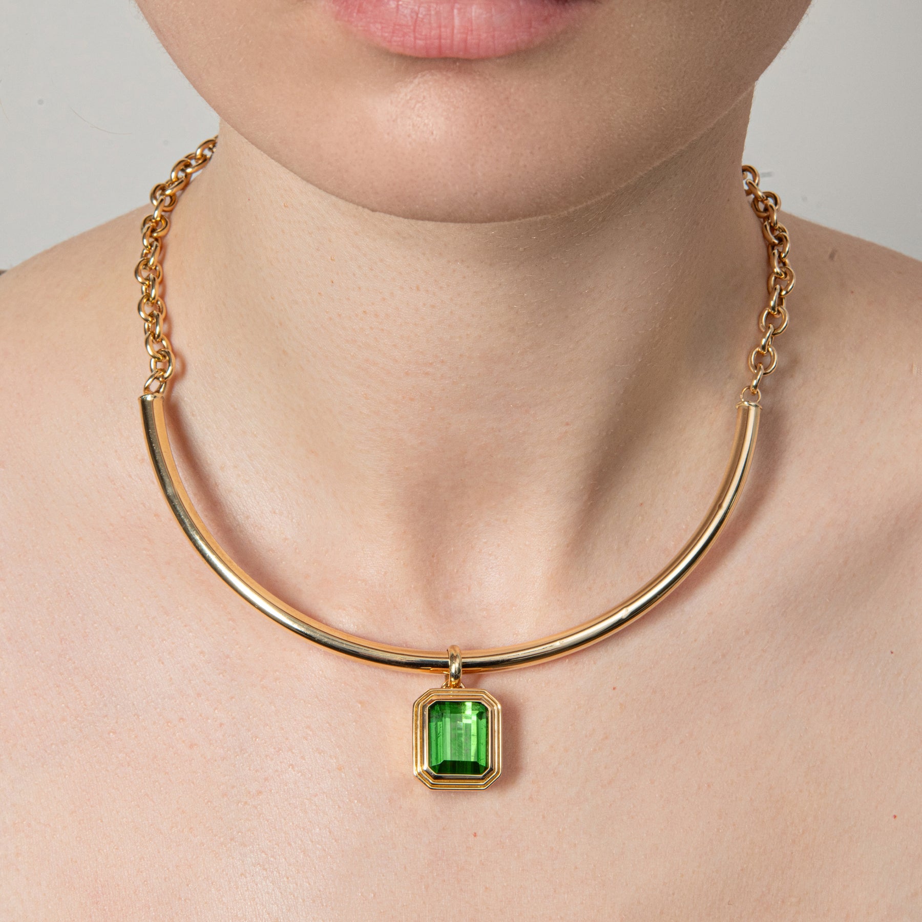 The Juliet Staggered Shape Pendant Necklace features an emerald-cut green tourmaline set in 18K yellow gold, suspended from a curved gold chain. The stepped setting adds dimension while highlighting the stone’s vivid green tone and crisp facets.