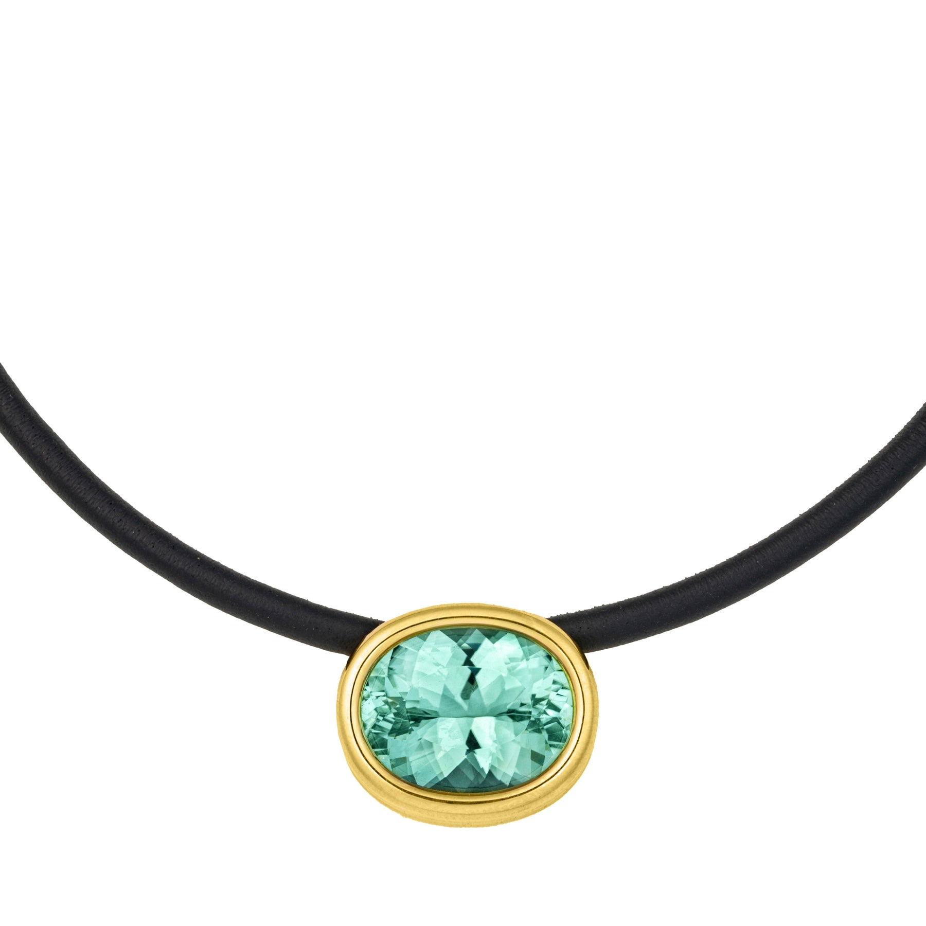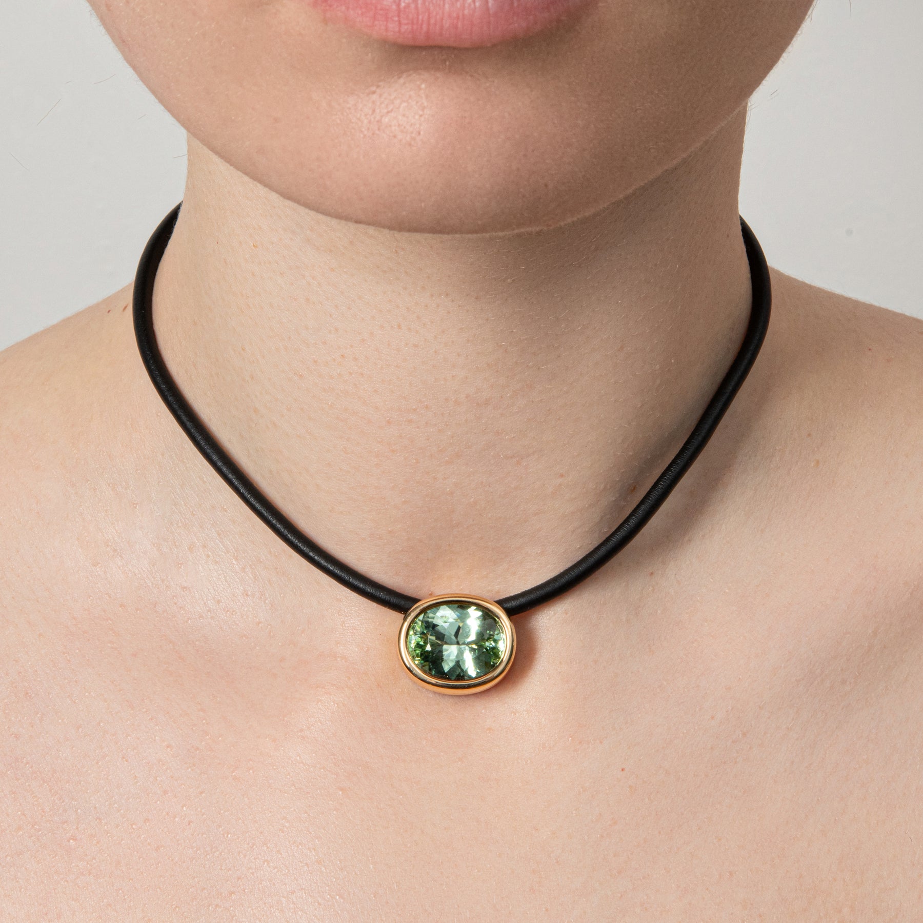 Choker necklace featuring a 13.60ct green tourmaline set in solid 18K yellow gold on an adjustable 16–18" black leather cord.