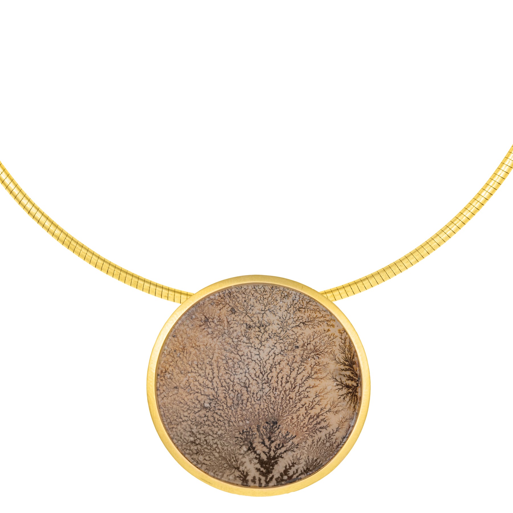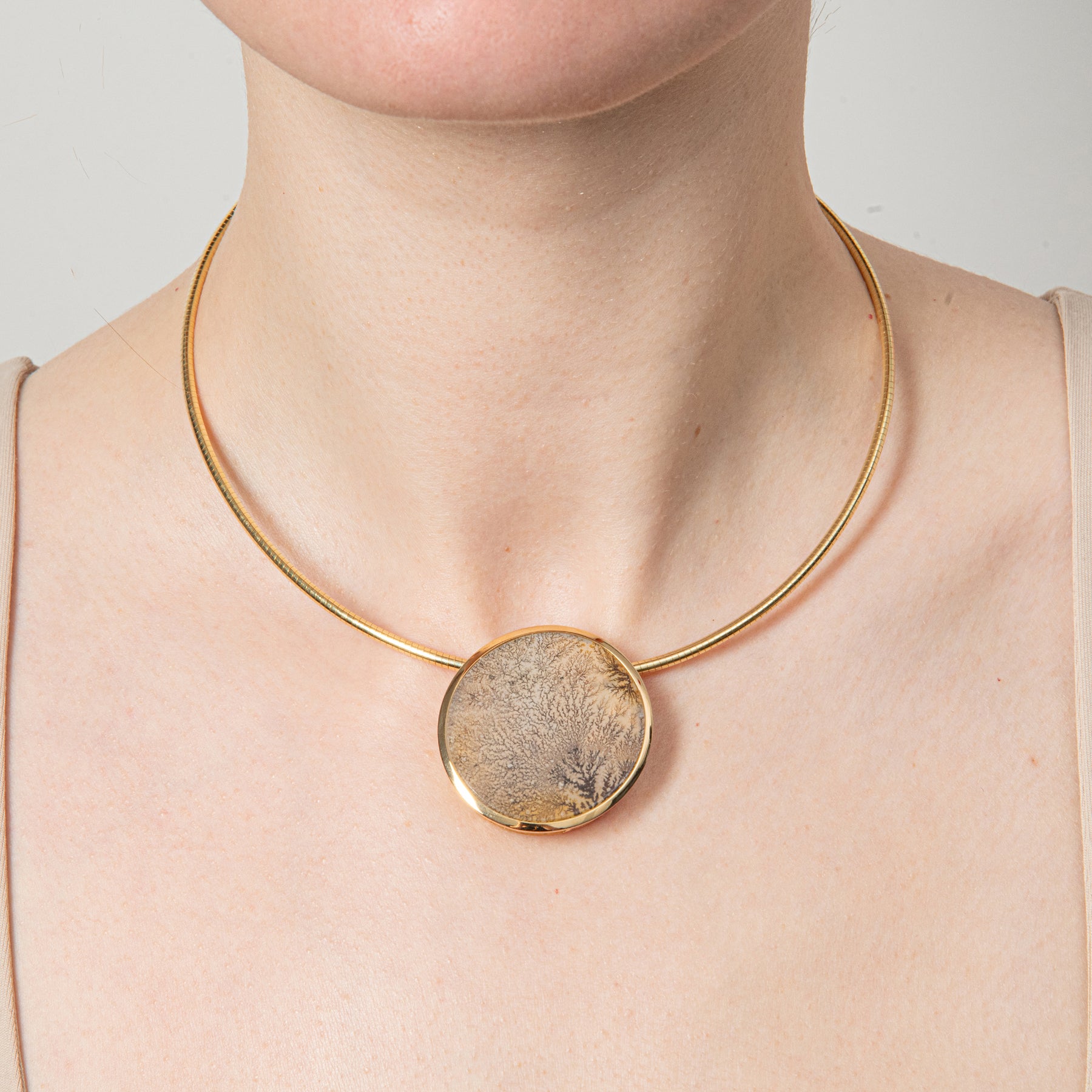Oversized round pendant featuring a natural dendrite stone set in solid 18K yellow gold. Each stone displays unique, organic patterning.